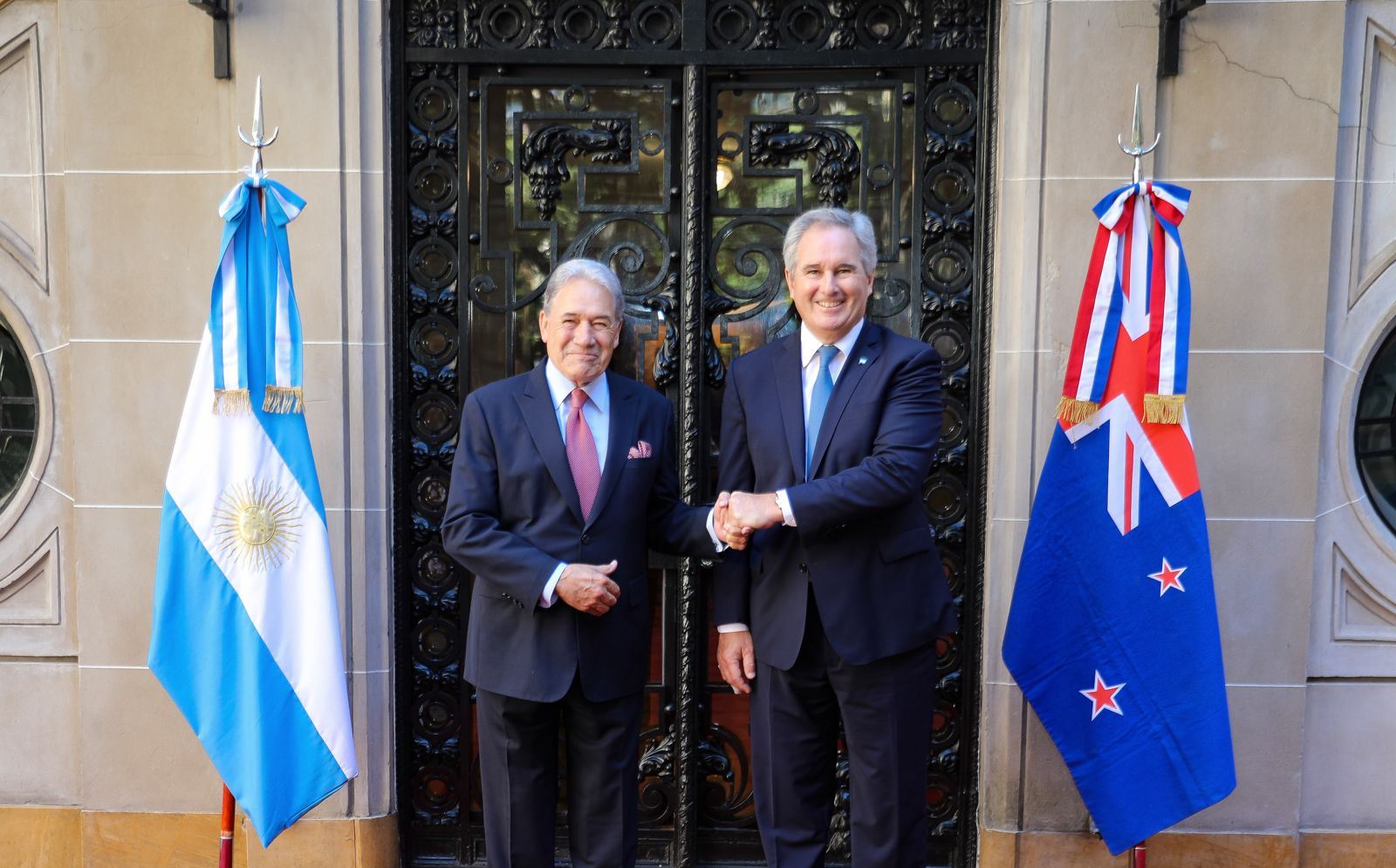 El Canciller Pablo Quirno recibió ayer en el Palacio San Martín al Ministro de Relaciones Exteriores de Nueva Zelanda, Rt. Hon Winston Peters, en el marco de la primera visita a la Argentina de un funcionario neozelandés de ese nivel en 19 años, lo que refleja el renovado interés de ambas partes en profundizar el vínculo bilateral.