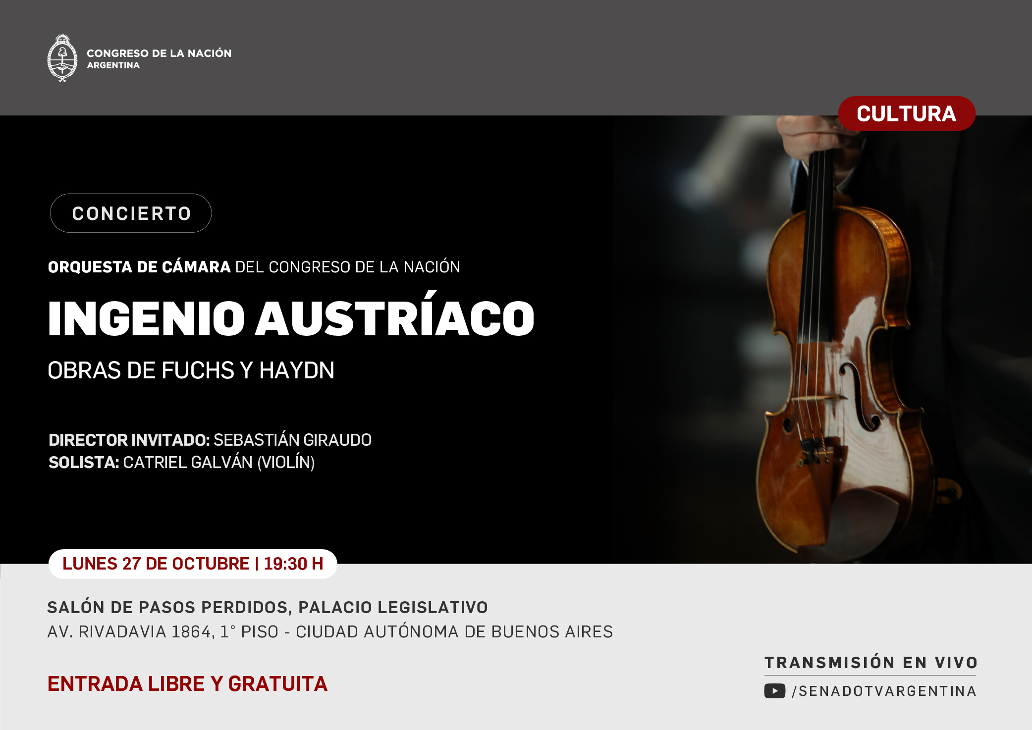 La Orquesta de Cámara del Congreso de la Nación presenta su octavo concierto del año y séptimo de la temporada oficial 2025 este lunes 27 de octubre a las 19:30 h en el Salón de Pasos Perdidos del Congreso Nacional, Av. Rivadavia 1864, CABA, con entrada libre y gratuita. Asimismo, se podrá ver en directo por el canal de YouTube del Senado de la Nación.